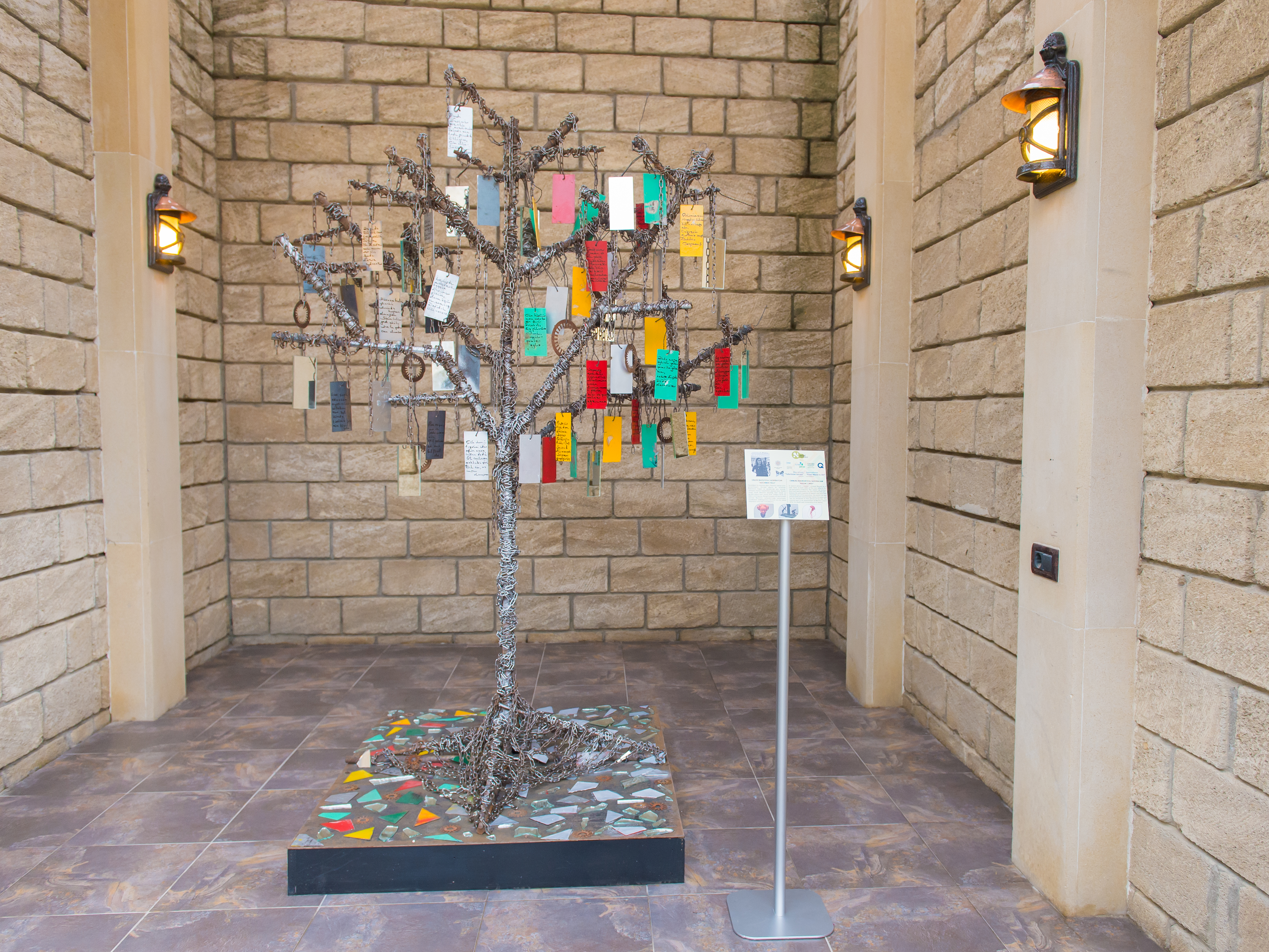 This tree was shown as the image of Nasimi. Nasimi's life and poetry are reflected on both sides of the tree. The viewer can approach it from two aspects. Thus, the colored side reflects Nasimi's life and poetry, and the pale side reflects the execution. The colored part is an assessment of Nasimi's poetry after his death and the immorality in his poems.